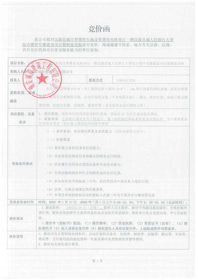 漢源縣城市智慧停車場(chǎng)及智慧充電樁項(xiàng)目一期漢源縣城人民銀行大型綜合樓停車樓建設(shè)項(xiàng)目塑鋼窗采購(gòu)競(jìng)價(jià)公告