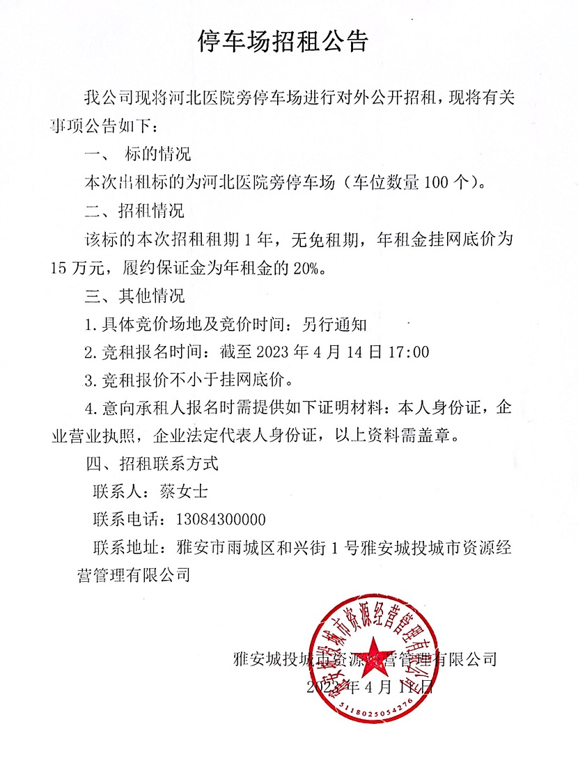 河北醫(yī)院旁停車場(chǎng)招租公告