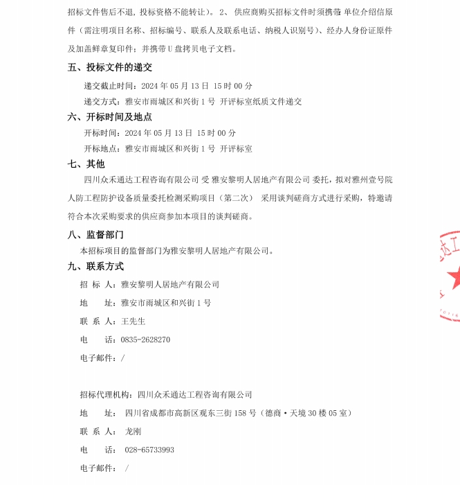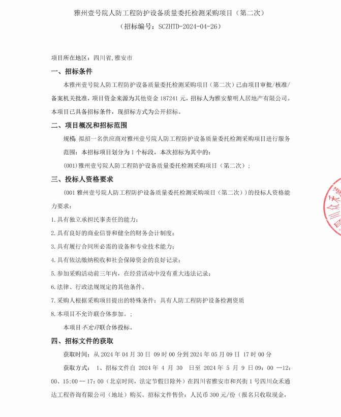 雅州壹號院人防工程防護設(shè)備質(zhì)量委托檢測采購項目(第二次)公告